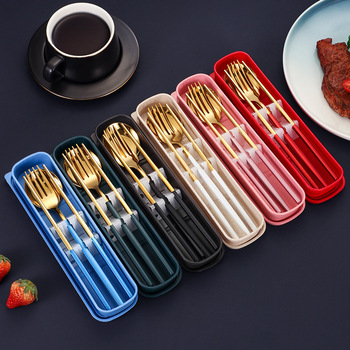 Juego de cubiertos portátil de acero inoxidable, cuchara de oficinista de tres piezas, tenedor, palillos, caja extraíble para exteriores, venta al por mayor
