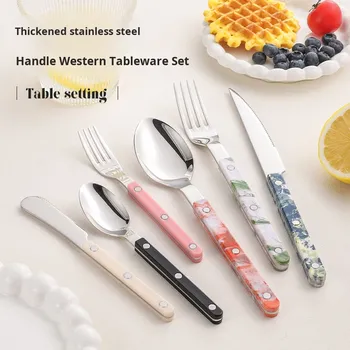 Juego moderno de seis piezas de acero inoxidable 304 con borde cruzado, cuchillo occidental para carne, tenedor, cuchara con mango de ABS, cubiertos de postre